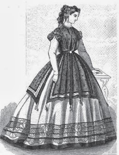 Women dresses were elongated due to a new a shape of crinoline. Fashionable colours were bright, rich, often contrasting, is was connected with a wide use of aniline dyes for fabrics. Men clothes was commonly black or dark-blue and had simple, strict lines.