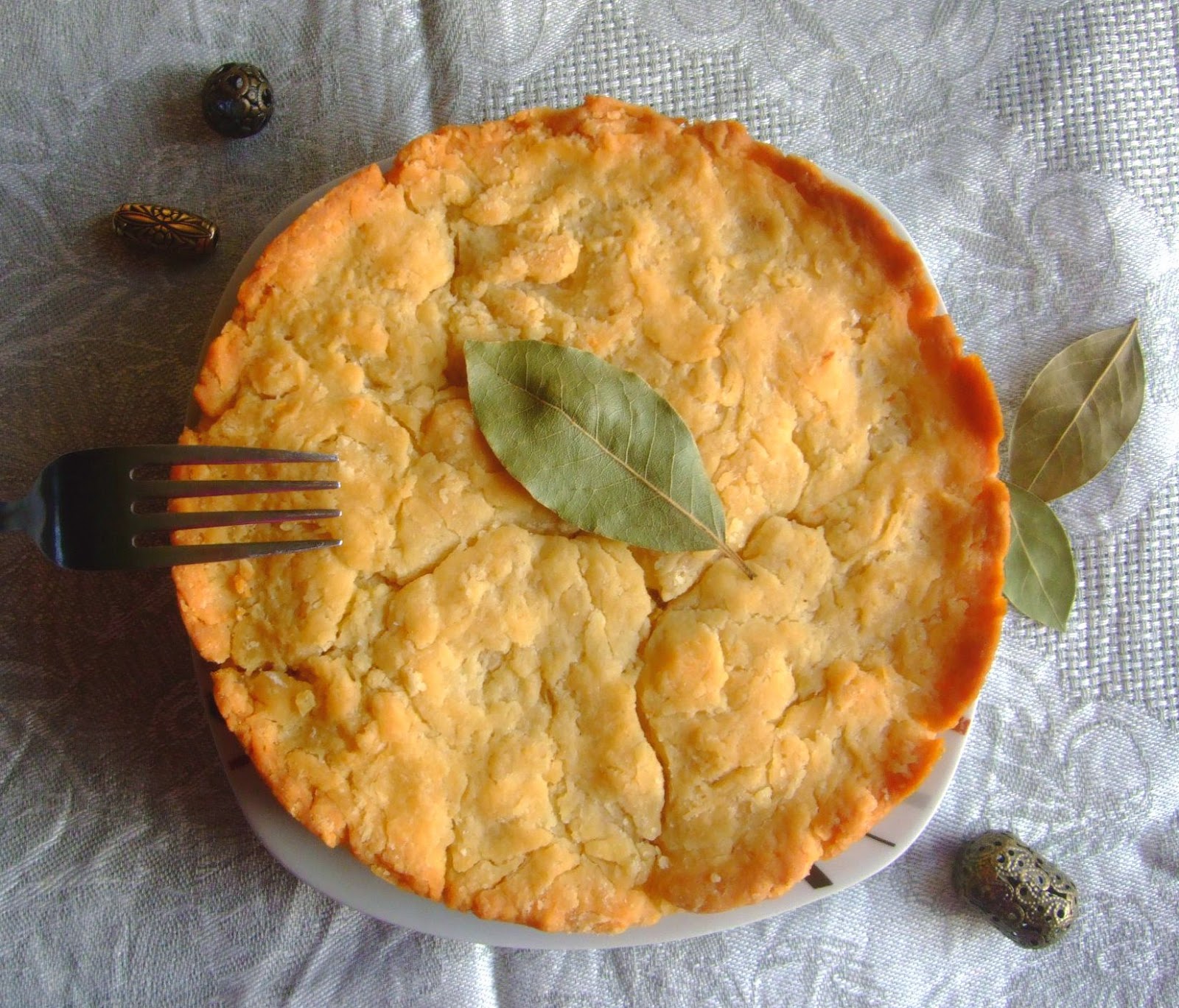своих гостей»]. Возьмите курицу обычного размера, не обязательно цыплёнка или очень молодую курочку, и отварите её в большом количестве подсоленной воды до мягкости, вытащив её, однако, прежде чем она окончательно разварится. Из 1 яйца, 0,5 стакана мягкого масла, 0,5 стакана крепких сливок [не менее 20% жирности] и муки сделать пластичное тесто. Выложить часть теста на дно посуды для запекания [она должна быть довольно низкой], сделав дно пирога толщиной 5-6 мм. Сверху выложить тонкий слой мелко порезанного куриного мяса, сдобренного специями по вкусу и немного маслом. Затем снова положить тесто и снова курицу так, чтобы края пирога доставали до верха формы. Сверху закрыть слоем теста достаточной толщины и размера, чтобы закрыть всю форму целиком. Выпекать на среднем огне примерно 80-90 минут.